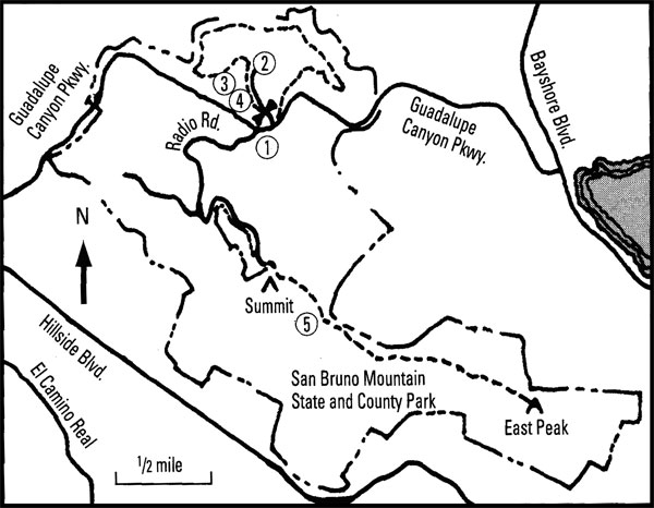 Eastern Access. If you're traveling from the south on Highway 101 take the Brisbane turnoff and travel north on Old Bayshore past Brisbane to Guadalupe Canyon Parkway. Turn left, and travel to the crest where the San Bruno Mountain State and County Park is located. From the north on Highway 101 take the Sierra Point turnoff, and follow Lagoon Rd. to the intersection of Old Bayshore. Turn right at Old Bayshore and proceed north to Guadalupe Canyon Parkway. Turn left, and continue to the park.