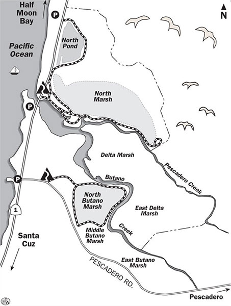 From anywhere on the peninsula, take the Bayshore Freeway (Highway 101) or Interstate 280 to Highway 92. Take 92 west to Half Moon Bay and follow it to the end. Turn south (left) on the Coastal Highway (Route 1) and in approximately 15 miles you will see signs for Pescadero State Beach. The marsh is on the opposite side of the road from the beach. From San Francisco follow I-280 to its intersection with Highway 1 south of Daly City and follow Highway 1 down the coast. There are winding ways via mountain roads for those who want to explore the interior of the county. A day in this area can be easily combined with other stops along Skyline, at Memorial Park, or along the Cloverdale/Butano/Gazos Creek corridor.