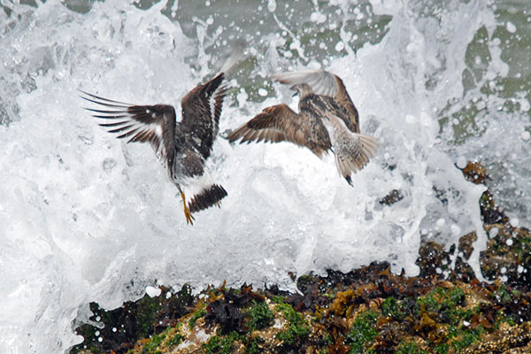 Surfbird and Red Knot escaping a wave, Pescadero State Beach, August 2011 (Pati Rouzer)