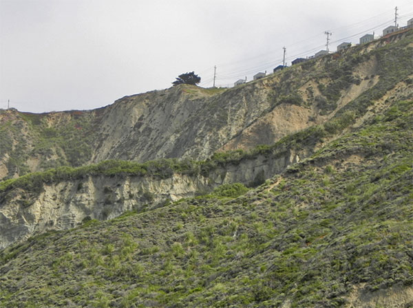 Houses along cliff, threatened by landslides and seismological activity. Mussel Rock, August 2011 (Jennifer Rycenga)