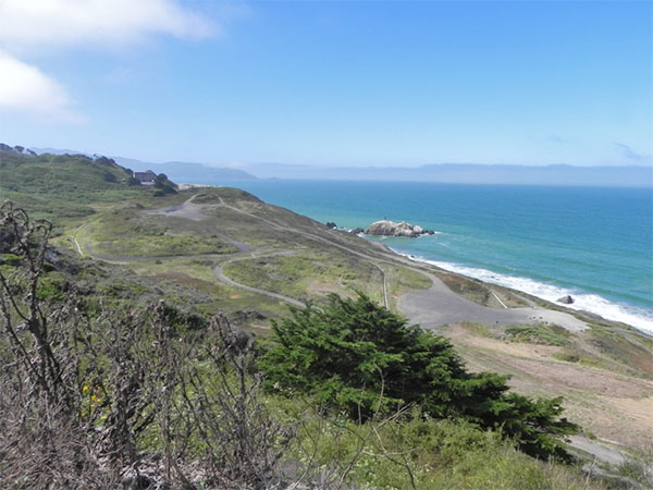 Steep gravel paths might pose difficulty for some; wear good hiking boots. This area is built on an old landfill, so there might be archeological levels of garbage revealed during wet weather seasons or after landslides. Temperatures are variable within the park, so dressing in layers is a good idea (as it usually is in the Bay Area). If an earthquake strikes, leave the area: you are safe from tsunamis on this cliff, but not from landslides. The area is used by dogs and their walkers, who usually have some off-leash canines. This parking lot is also used by bored youths, so don't leave valuables in your car.